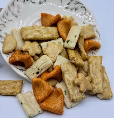 НашиСмесь японских рисовых крекеров - это восхитительный ассортимент хрустящих, пикантных закусок, вдохновленных традиционным сэмбэем. Изготовленные из риса премиум-класса и запеченные/обжаренные до совершенства, эти крекеры легкие, хрустящие и полны вкуса. Идеально подходят для перекусов, праздничных блюд или розничной упаковки.